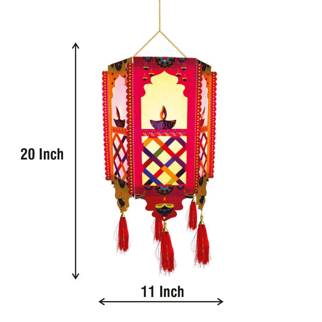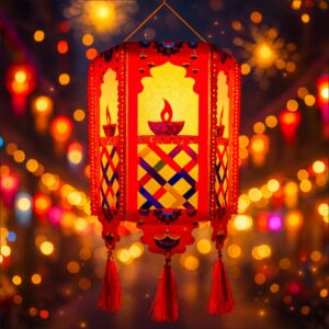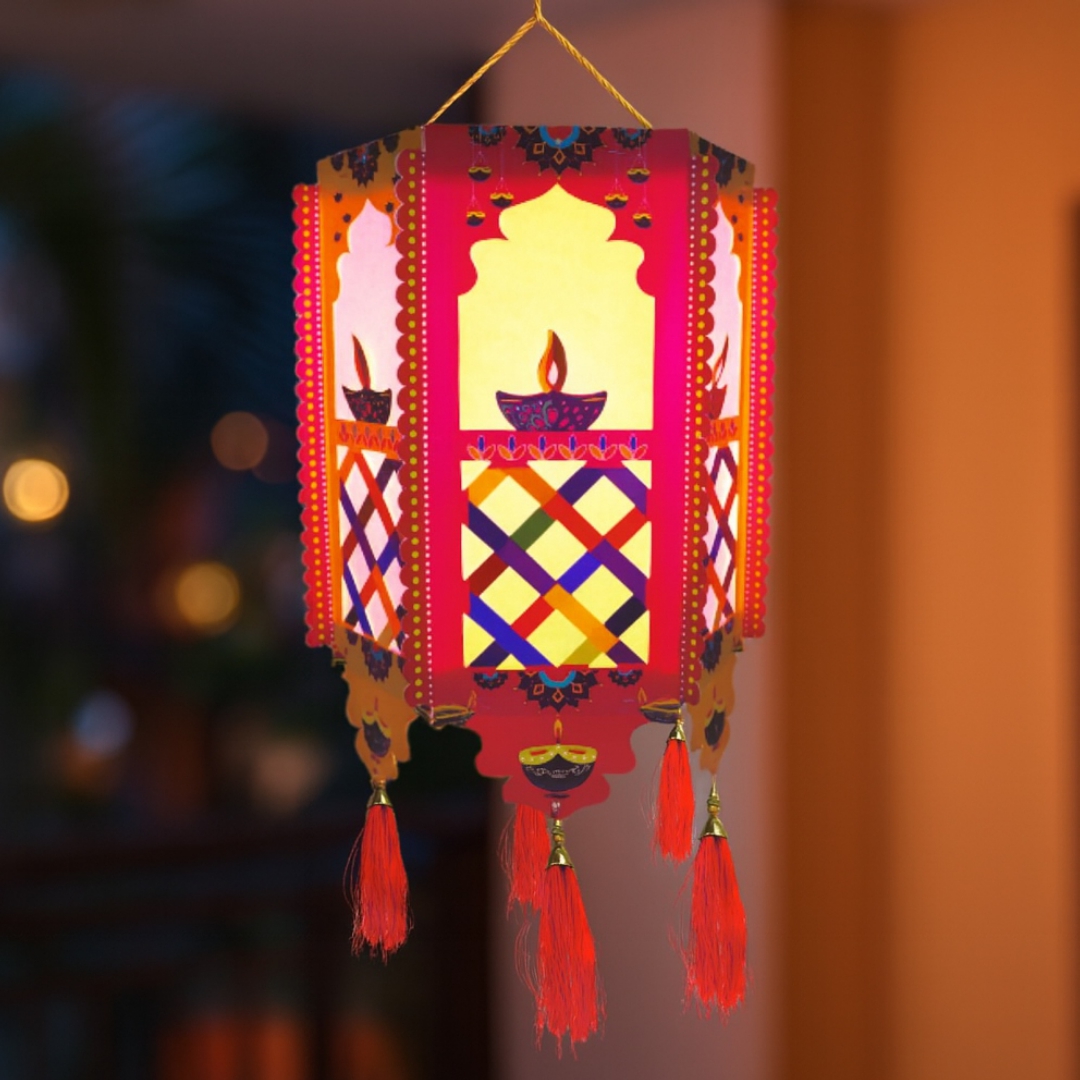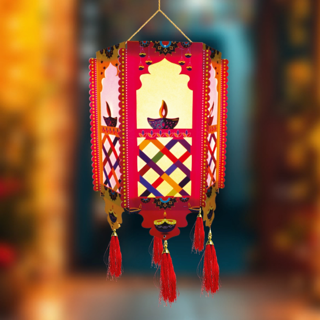 Crafted with vibrant colors, intricate patterns, and delicate tassels, this premium paper lantern is designed to brighten your home, office, shop, or event space during Diwali and other festive occasions. Its radiant glow adds a royal charm, creating a warm and welcoming atmosphere for family, friends, and guests.