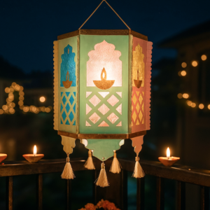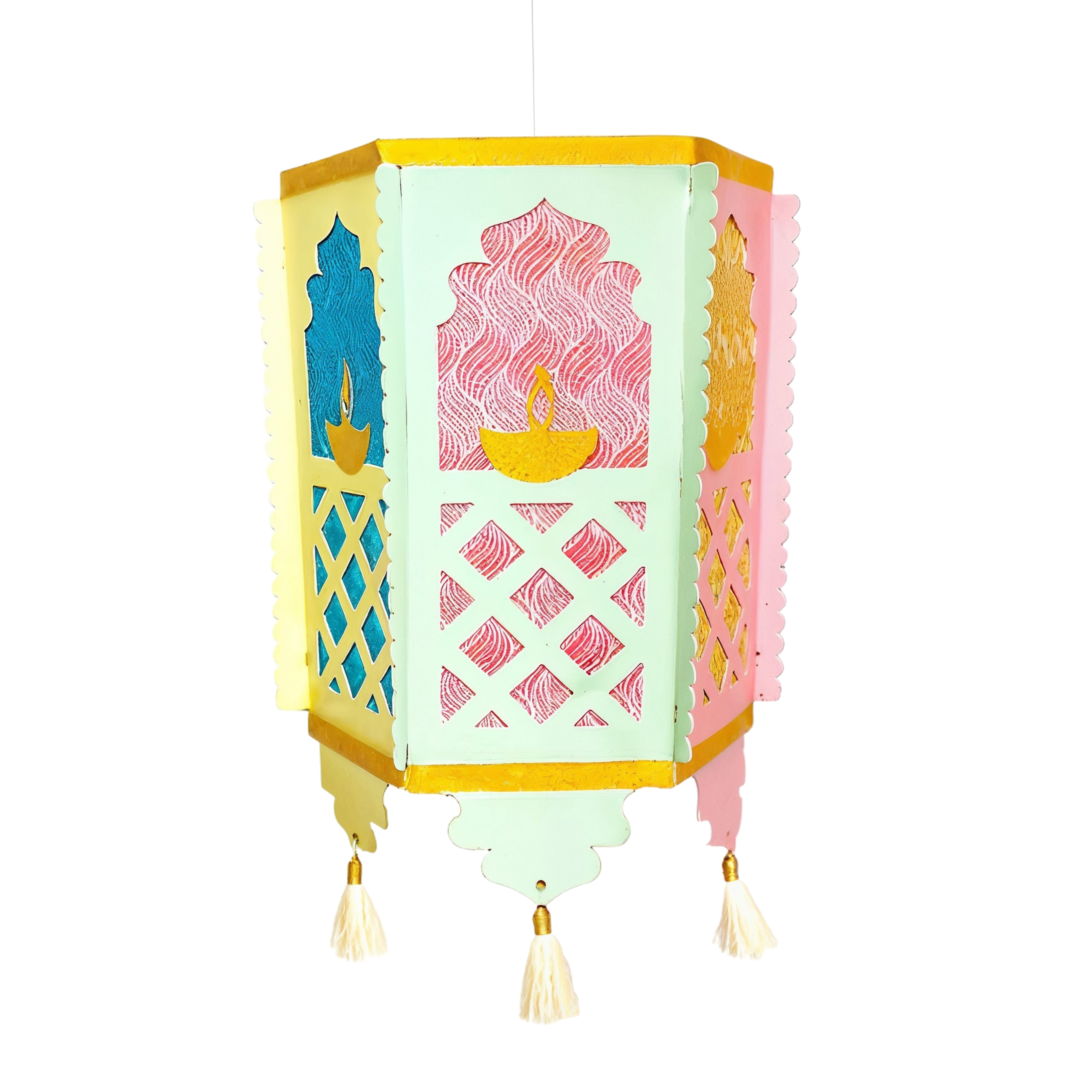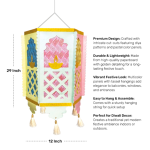 With its soft pastel hues, golden detailing, and traditional Diya cutwork, this handcrafted paper lantern creates a warm and welcoming atmosphere. Ideal for Diwali décor, festive events, shops, homes, and offices, the Maharaja Kandil adds a serene yet luxurious charm to any space.