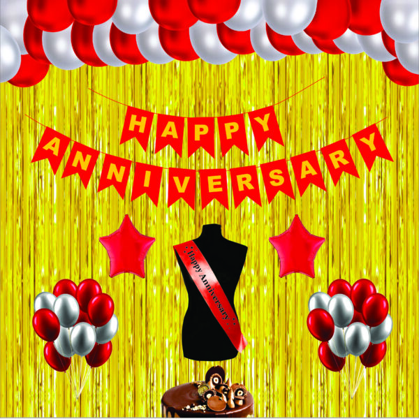 Celebrate your special milestone with THE DECOR QUEEN Golden Anniversary Decoration Kit. This 37-piece set includes elegant red and white balloons, shimmering party curtains, and a stylish party sash, perfect for creating a romantic ambiance. Ideal for 25th, 50th, or wedding anniversaries, this kit adds charm to your celebration, making it memorable for couples, husbands, and wives. Easy to set up and perfect for home or banquet hall decor.